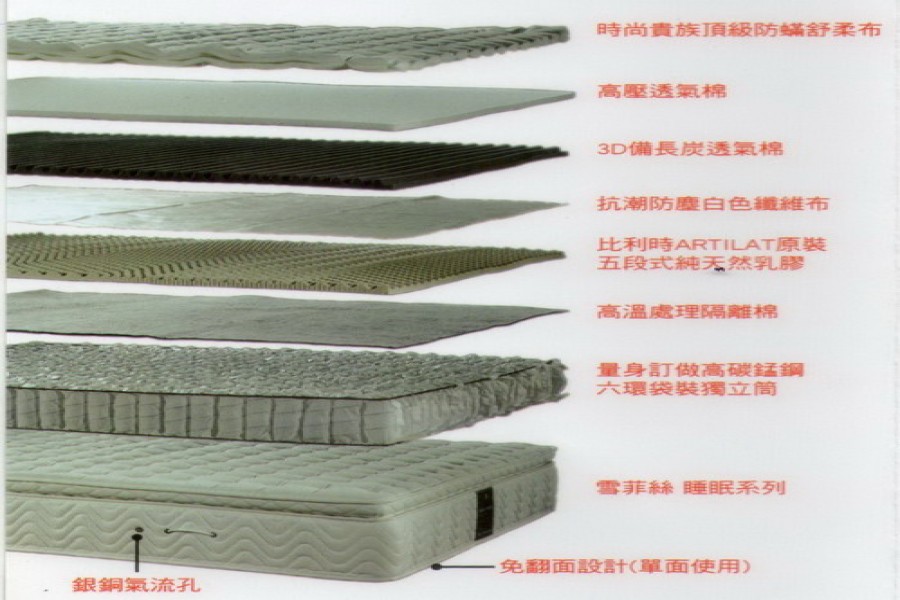 採用比利時 ARTILAT 原裝五段式純天然乳膠,不定向孔膠,依照身體各部位的重量,更能提高點對點的支撐,乳膠是從橡膠樹中吸取出來的汁液,經由發酵~加熱~水洗~加工,細微發泡烘烤定型處理,即成為乳膠°因乳膠取材於自然植物材質,具有殺菌和除黴菌物質,特別適用過敏患者