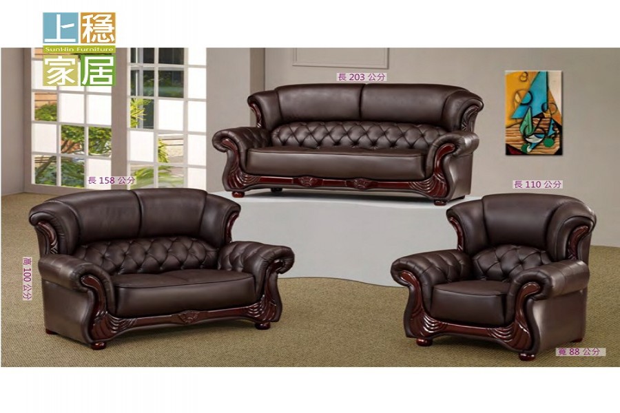 --煌益木刻咖啡色皮革1+2+3沙發組