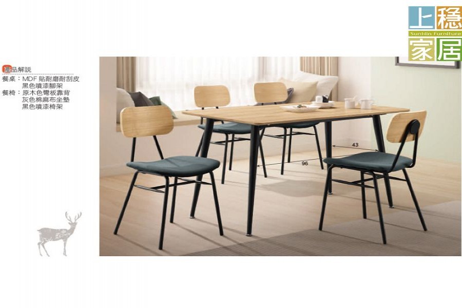 餐桌:MDF貼耐磨耐刮皮、黑色噴漆腳架