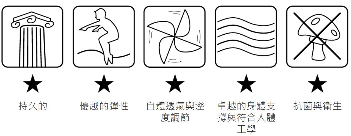 3.比利時Artilat®乳膠比利時Artilat®乳膠具持久性、優越的彈性、自體透氣與濕度調節、卓越的身體支撐與符合人體工學及抗菌與衛生之功能。