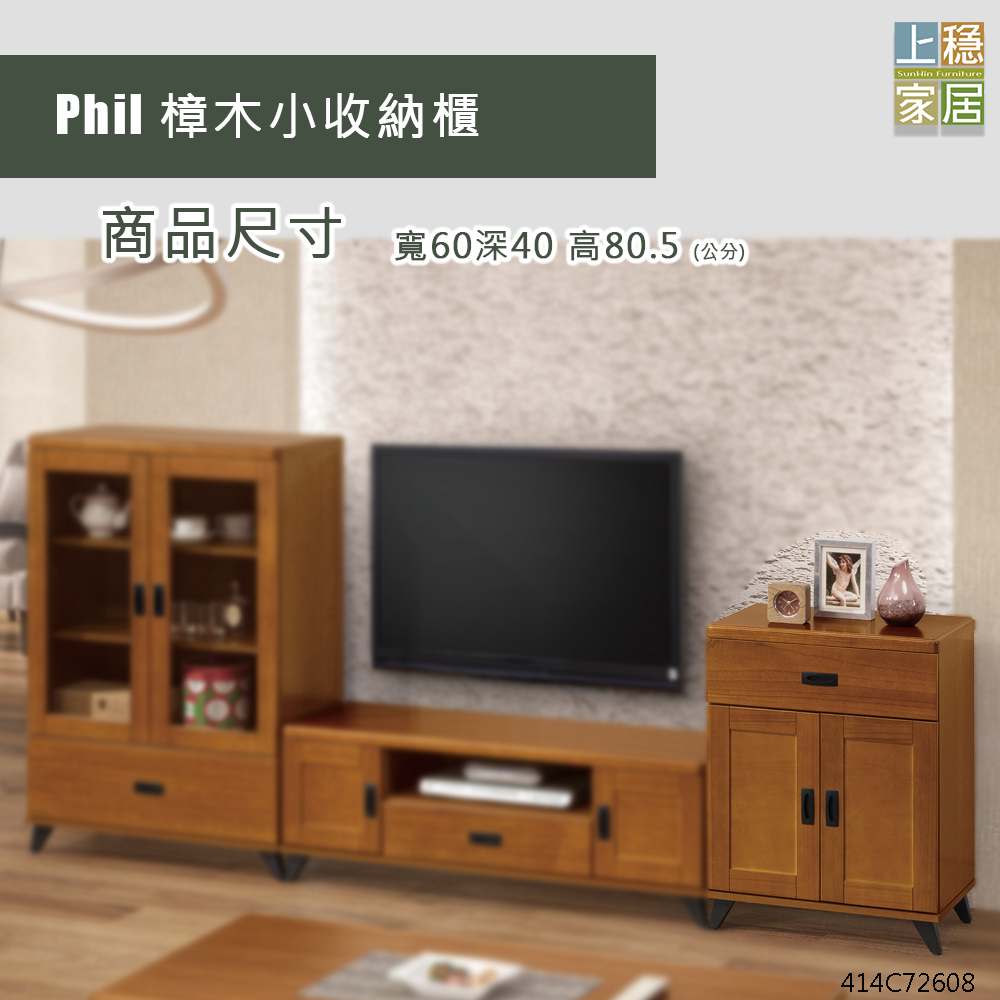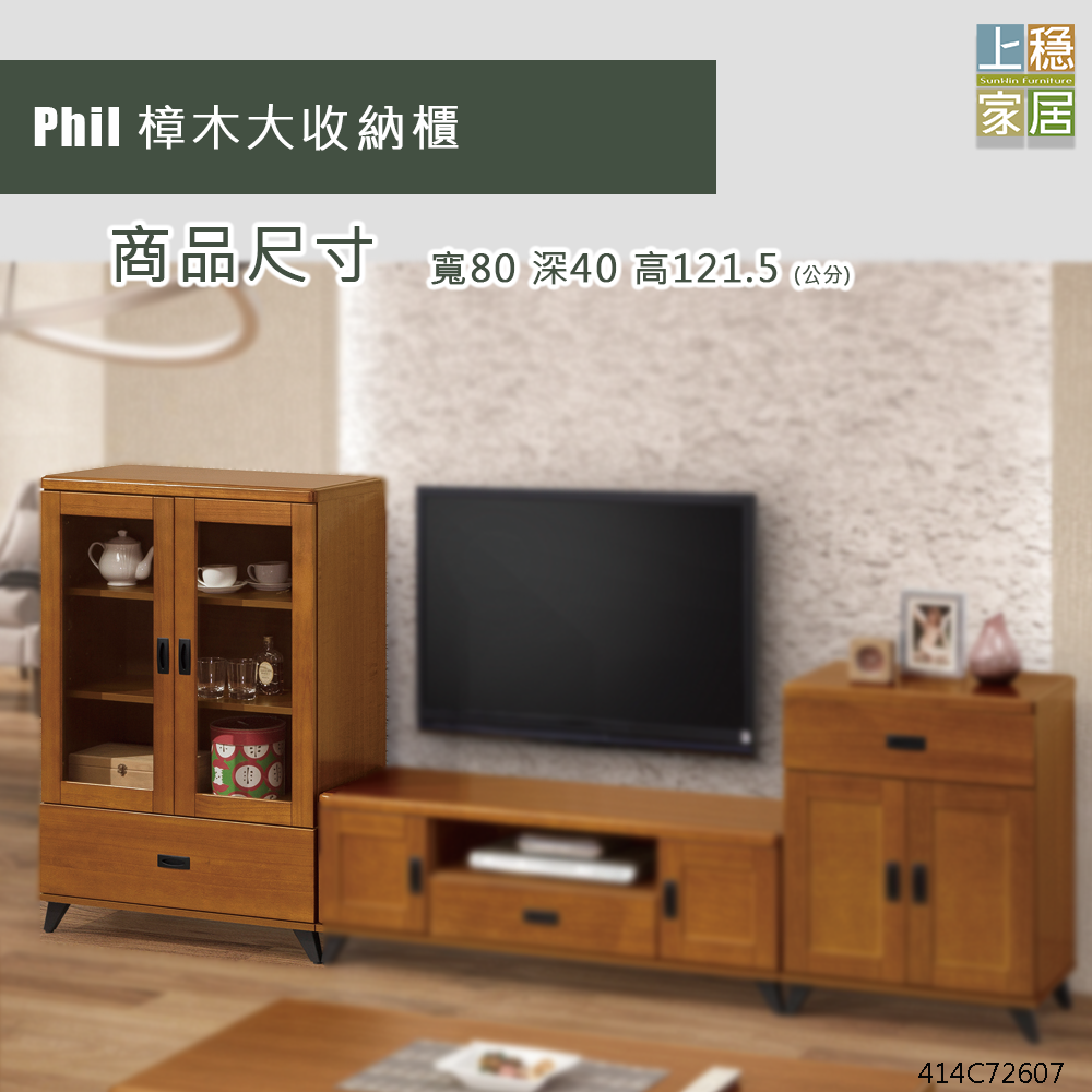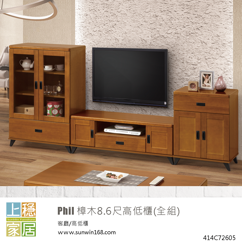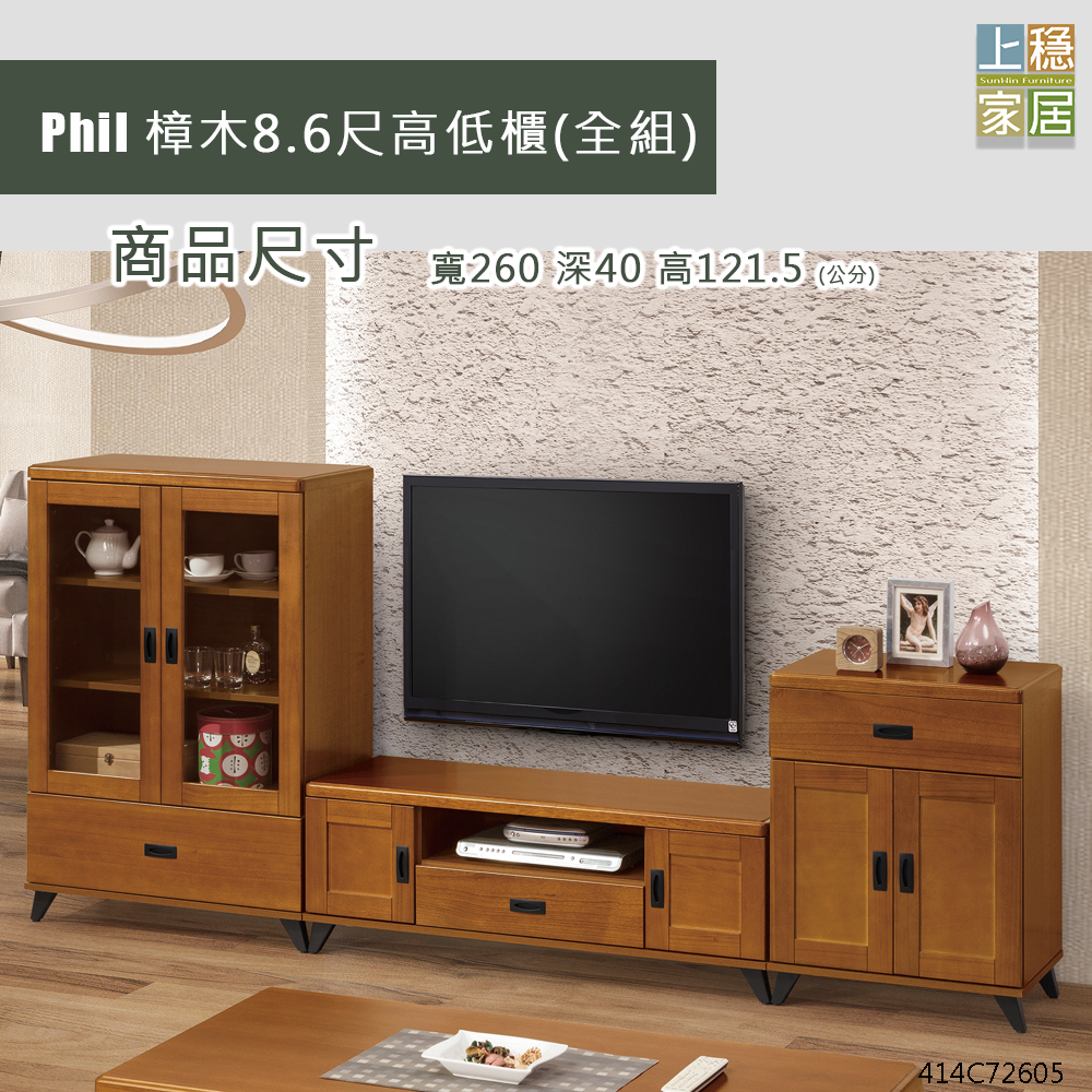--Phil 樟木8.6尺中低櫃(全組) 寬260*深40*高121.5公分 --Phil 樟木4尺長櫃 寬120*深40*高44.5公分 --Phil 樟木大收納櫃 寬80*深40*高121.5公分 --Phil 樟木小收納櫃 寬60*深40*高80.5公分