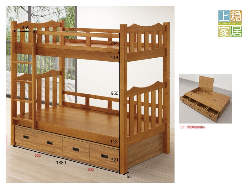 --凡艾樟木色3.5尺雙層床+床下抽屜盒